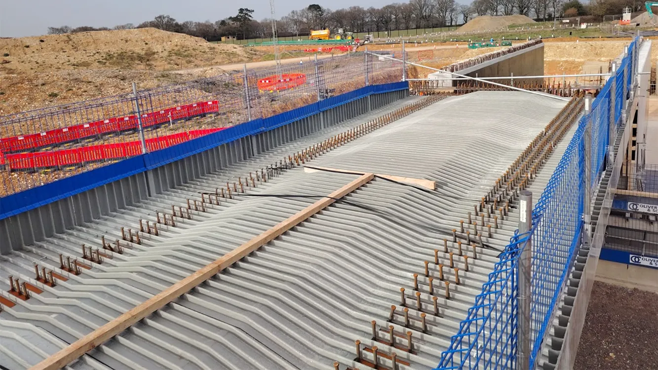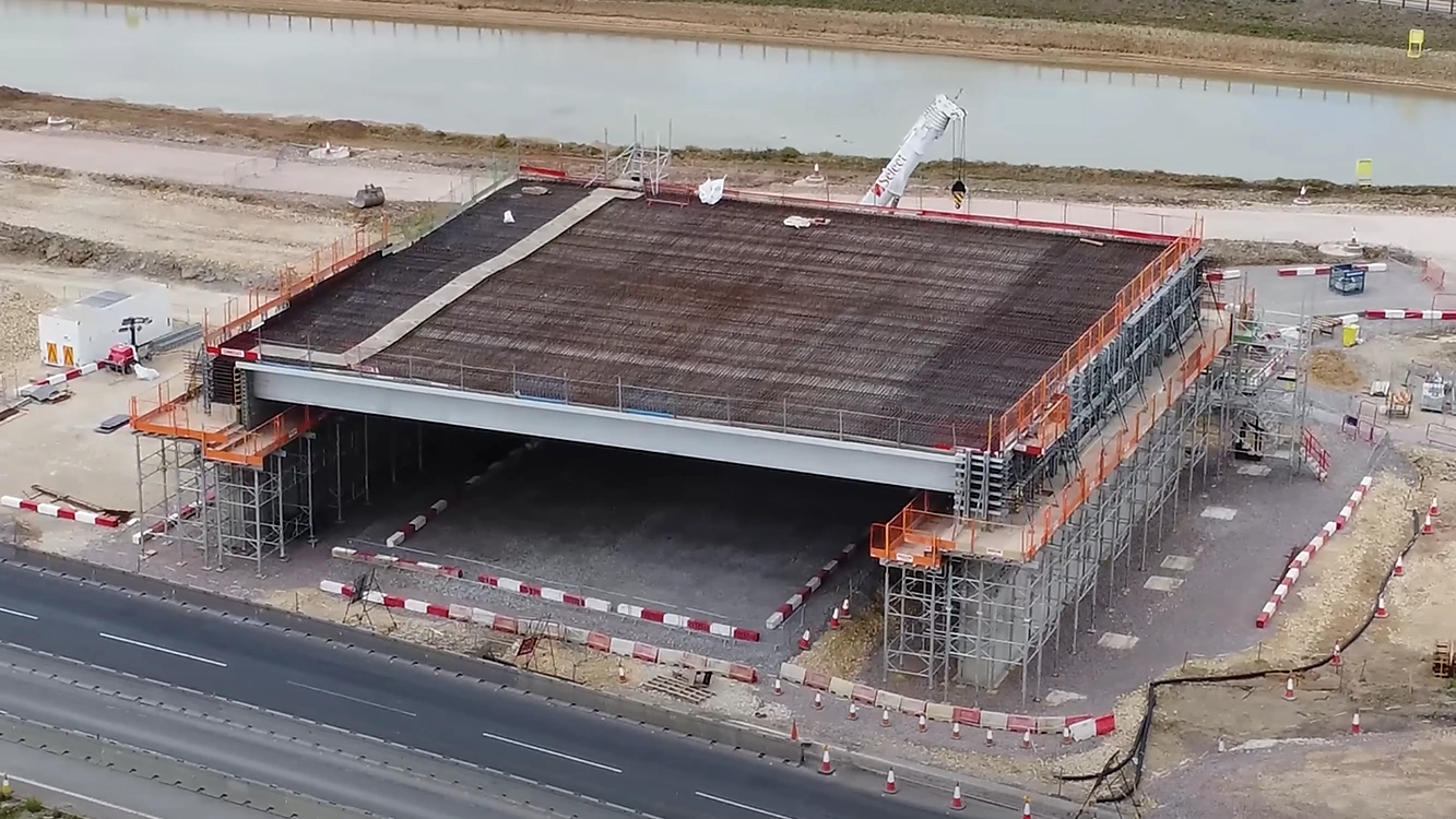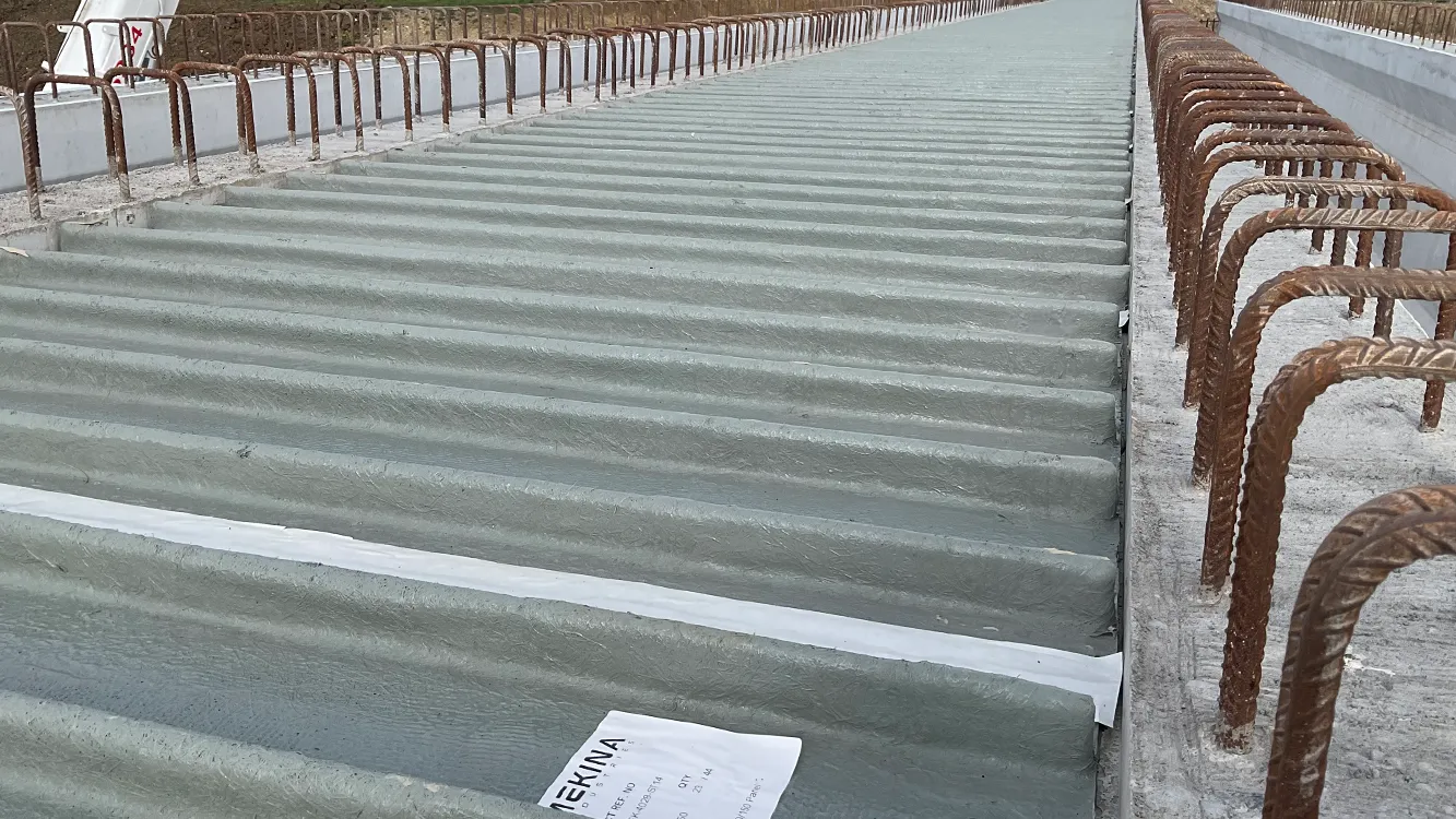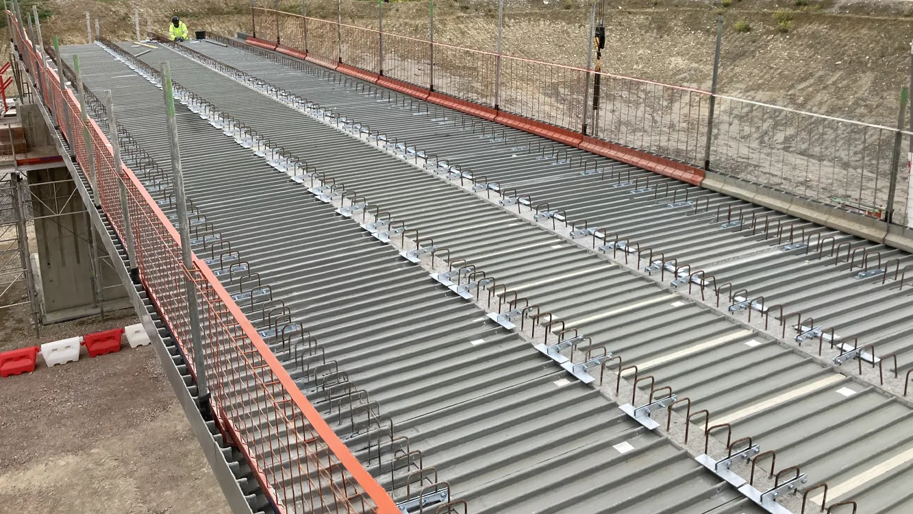 Mekina was selected by Skanska to supply its Mek-Dek GRP Permanent Formwork Panels for the project. The works involved installing Mek-Dek Standard panels above and between precast W13 beams and our Mek-Dek Smart Edge L-shaped Cantilever panels to span over the outer beam and form the cantilever deck edge. The panels were engineered to provide a load-bearing cantilever solution, tailored to the project’s safety and installation requirements.
